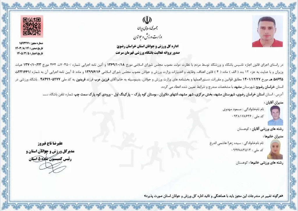 در سال ۱۳۹۹ در شهر مشهد با هدف آماده سازی نفرات مستعد و شرکت در انتخابی های تیم ملی،با تعدادی ورزشکار برتر کشور زیر نظر فرزین عرب فعالیت خود را آغاز کرد،و هر ساله توانستیم نماینده ای در تیم ملی جهت حضور در مسابقات قهرمانی آسیا داشته باشیم.